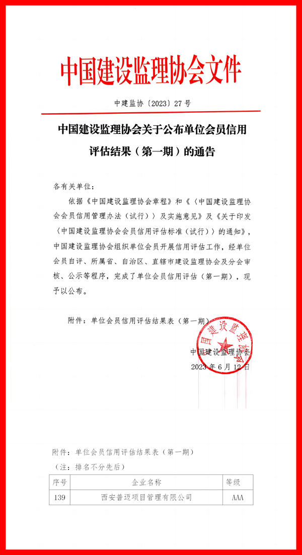 2023年6月12日,中國建設(shè)監(jiān)理協(xié)會印發(fā)《中國建設(shè)監(jiān)理協(xié)會關(guān)于公布單位會員信用評估結(jié)果(第一期)的通告》,公布“單位會員信用評估結(jié)果表(第一期)”,西安普邁項目管理有限公司位列其中,獲評AAA級企業(yè)。