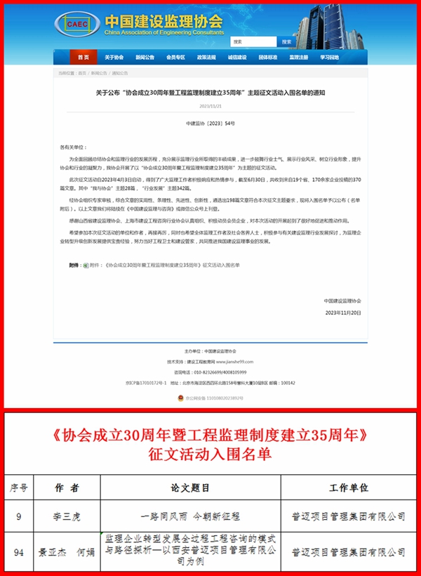 2023年11月20日,中國(guó)建設(shè)監(jiān)理協(xié)會(huì)公布“協(xié)會(huì)成立30周年暨工程監(jiān)理制度建立35周年”主題征文活動(dòng)入圍名單,由我公司董事長(zhǎng)李三虎撰寫(xiě)的“我與協(xié)會(huì)”主題論文《一路同風(fēng)雨 今朝新征程》及總經(jīng)理景亞杰、項(xiàng)目管理工程師何娟撰寫(xiě)的“行業(yè)發(fā)展”主題論文《監(jiān)理企業(yè)轉(zhuǎn)型發(fā)展全過(guò)程工程咨詢(xún)的模式與路徑探析—以西安普邁項(xiàng)目管理有限公司為例》成功入圍,以上文章中國(guó)建設(shè)監(jiān)理協(xié)會(huì)將陸續(xù)在《中國(guó)建設(shè)監(jiān)理與咨詢(xún)》或微信公眾號(hào)上刊登,屆時(shí)普邁公司公眾號(hào)也將即時(shí)轉(zhuǎn)載,讓我們共同期待!