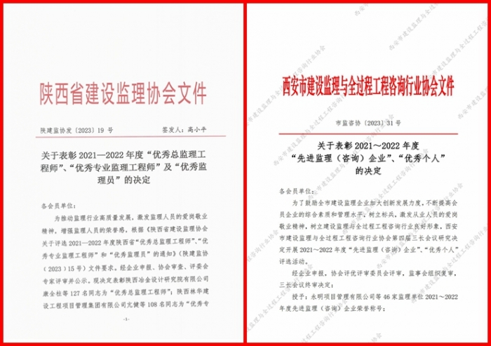 公司榮獲2021-2022 年度西安市“先進(jìn)監(jiān)理(咨詢)企業(yè)”