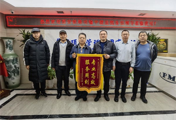 “專業(yè)高效,服務周到?!?/span>2023年12月20日,西安鐵路運輸中級法院副院長李建軍、二級高級警長宋林海、二級警長王根存一行蒞臨普邁項目管理集團有限公司,對普邁為法院審判法庭建設項目其提供的優(yōu)質(zhì)代建服務表示感謝并贈予“專業(yè)高效,服務周到?!?/span>錦旗。