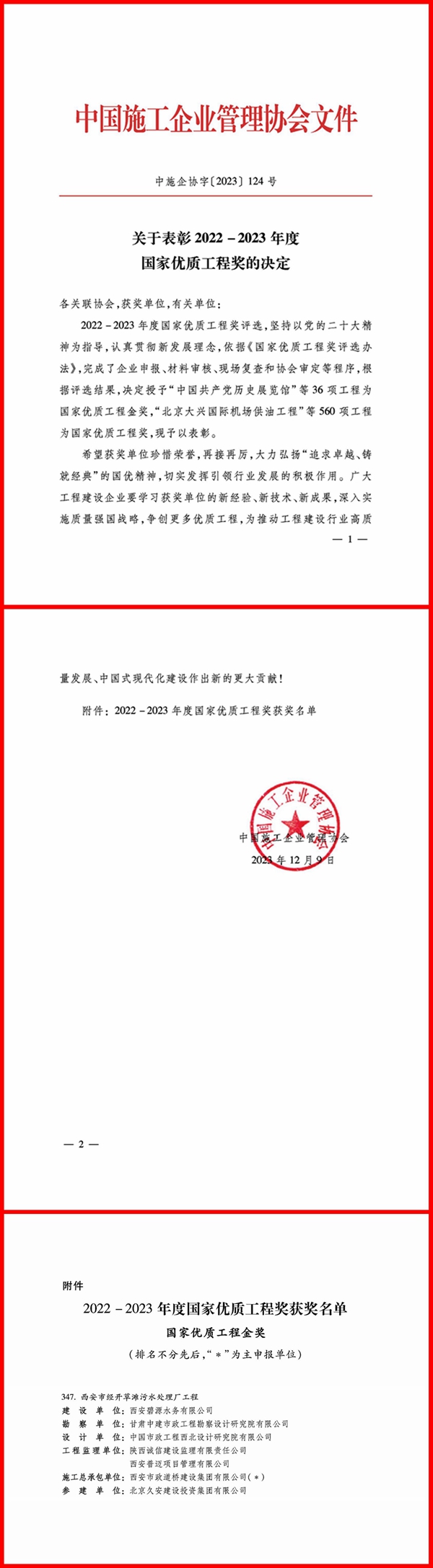 近日,中國施工企業(yè)管理協(xié)會發(fā)布《關(guān)于表彰2022-2023年度國家優(yōu)質(zhì)工程獎的決定》,其中,由公司承監(jiān)的西安市經(jīng)開草灘污水處理廠工程光榮上榜,榮獲“2022-2023年度國家優(yōu)質(zhì)工程獎”。