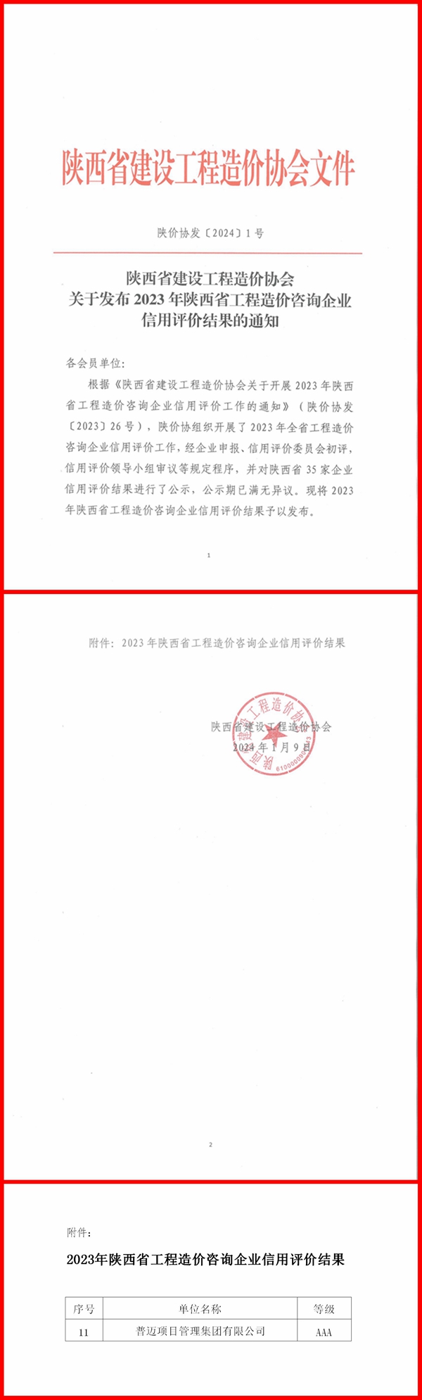 2024年1月9日,陜西省建設(shè)工程造價協(xié)會發(fā)布《陜西省建設(shè)工程造價協(xié)會關(guān)于發(fā)布2023年陜西省工程造價咨詢企業(yè)信用評價結(jié)果的通知》,普邁項目管理集團(tuán)有限公司在2023年陜西省工程造價咨詢企業(yè)信用評價中榮獲AAA級!
