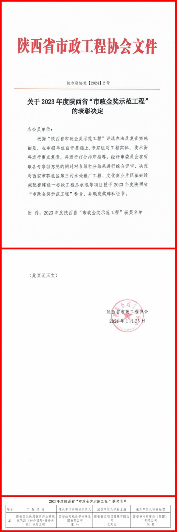 2024年1月25日,陜西省市政工程協(xié)會發(fā)布《關(guān)于2023年度陜西省“市政金獎示范工程”的表彰決定》,共31項(xiàng)工程獲此殊榮,由我公司承監(jiān)的西安國家民用航天產(chǎn)業(yè)基地航飛路(神舟四路-神舟大道)市政工程位列其中,光榮上榜!