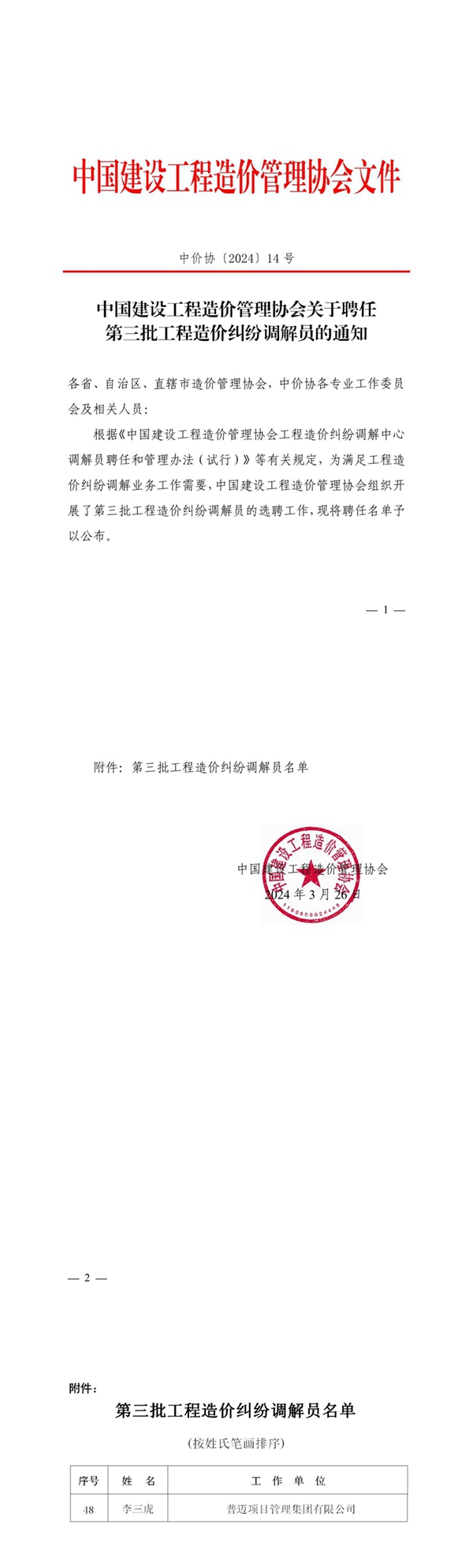 2024年3月26日,中國建設工程造價管理協(xié)會發(fā)布了《中國建設工程造價管理協(xié)會關于聘任第三批工程造價糾紛調解員的通知》,公布了《第三批工程造價糾紛調解員名單》,我公司董事長李三虎位列其中,幸榮擔任中國建設工程造價管理協(xié)會第三批工程造價糾紛調解員!