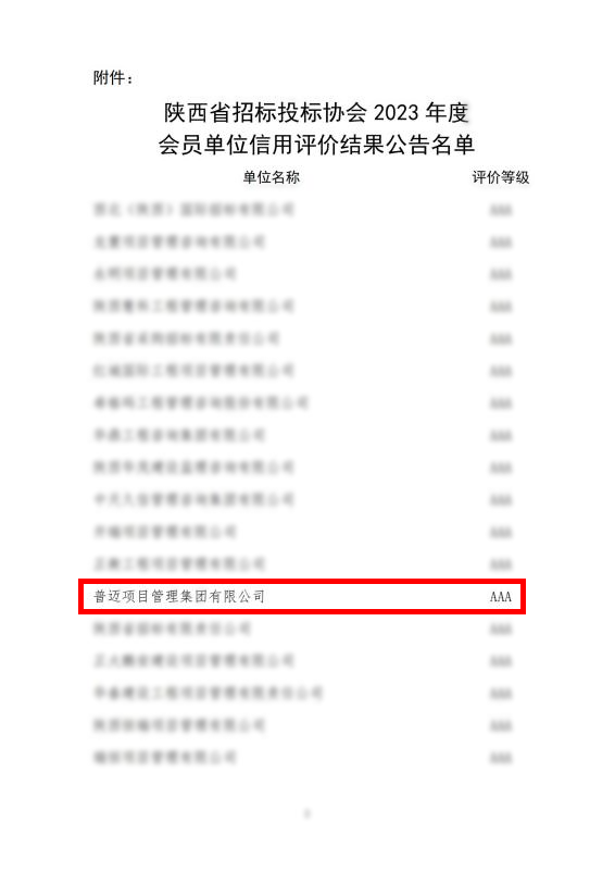 2024年6月25日,陜西省招標(biāo)投標(biāo)協(xié)會(huì)發(fā)布《陜西省招標(biāo)投標(biāo)協(xié)會(huì)2023年度會(huì)員單位信用評(píng)價(jià)結(jié)果公告》,普邁項(xiàng)目管理集團(tuán)有限公司憑借完善的管理制度、規(guī)范的業(yè)務(wù)流程、良好的商業(yè)信譽(yù)成功榮獲AAA級(jí)信用評(píng)價(jià)。