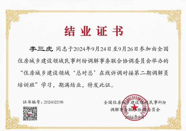為深入推進住房城鄉(xiāng)建設領域民事糾紛“總對總”在線訴調(diào)對接試點工作,不斷提高調(diào)解員規(guī)范化、專業(yè)化水平,9月24日-26日,由全國住房城鄉(xiāng)建設領域民事糾紛調(diào)解事務聯(lián)合協(xié)調(diào)委員會(以下簡稱全國住建聯(lián)調(diào)委)主辦、全國市長研修學院(住房和城鄉(xiāng)建設部干部學院)承辦的“住房城鄉(xiāng)建設領域‘總對總’在線訴調(diào)對接第二期調(diào)解員培訓班”在山東省青島市舉辦,700多人參加培訓。我公司董事長李三虎作為中價協(xié)資深會員、陜價協(xié)推薦中價協(xié)聘任全國住建聯(lián)調(diào)委認證的調(diào)解員參加了本次培訓學習。
