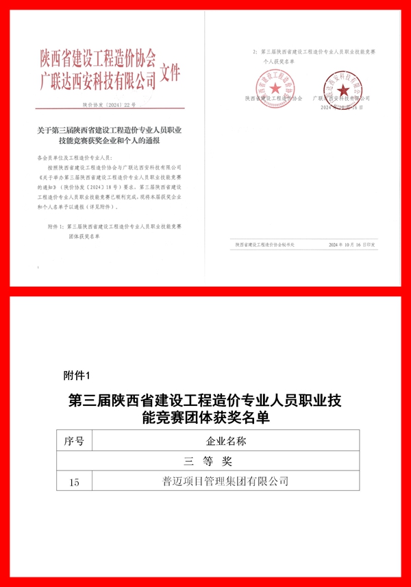 2024年10月17日,第三屆陜西省工程造價(jià)專(zhuān)業(yè)人員技能競(jìng)賽獲獎(jiǎng)結(jié)果公布,普邁項(xiàng)目管理集團(tuán)有限公司榮獲團(tuán)體三等獎(jiǎng)!