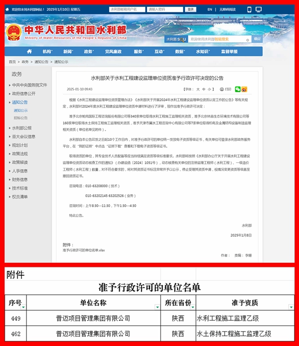 2025年1月8日,公司資質(zhì)申報(bào)工作傳來(lái)喜訊,經(jīng)中華人民共和國(guó)水利部核準(zhǔn),公司喜獲水利工程施工監(jiān)理乙級(jí)、水土保持工程施工監(jiān)理乙級(jí)兩項(xiàng)資質(zhì)!