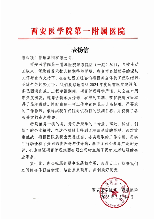 2025年1月14日,建設(shè)單位西安醫(yī)學(xué)院第一附屬醫(yī)院給公司發(fā)來表揚信,為公司在西安醫(yī)學(xué)院第一附屬醫(yī)院灃東院區(qū)(一期)項目建設(shè)中提供的全過程工程咨詢服務(wù)點贊!