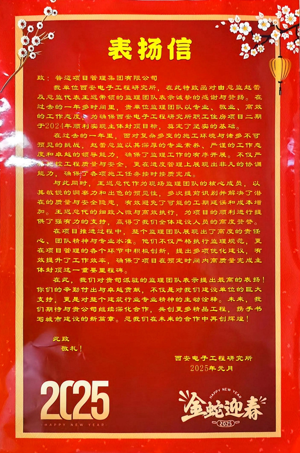一面錦旗,承載著信任與肯定;一封表揚信,記錄著付出與責(zé)任。普邁感恩新老客戶對普邁服務(wù)質(zhì)量的認(rèn)可,感謝諸位業(yè)主一直以來的支持與信任,我們將繼續(xù)努力,以更加負(fù)責(zé)的態(tài)度、更加專業(yè)的水準(zhǔn)、更加優(yōu)質(zhì)的服務(wù)為您的建設(shè)項目保駕護航!