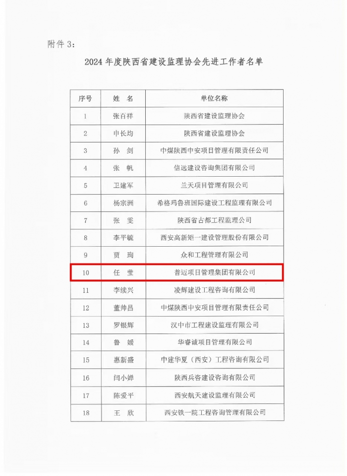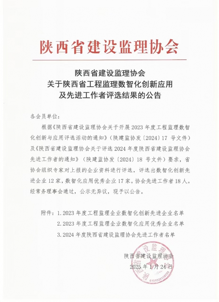 2025年1月24日,陜西省建設(shè)監(jiān)理協(xié)會發(fā)布《關(guān)于陜西省工程監(jiān)理數(shù)智化創(chuàng)新應(yīng)用及先進(jìn)工作者評選結(jié)果的公告》,普邁項(xiàng)目管理集團(tuán)有限公司憑借在工程監(jiān)理數(shù)智化應(yīng)用方面的突出表現(xiàn),獲評“2023年度工程監(jiān)理企業(yè)數(shù)智化應(yīng)用先進(jìn)企業(yè)”。同時,公司辦公室主任任瑩同志榮獲“2024年度陜西省建設(shè)監(jiān)理協(xié)會先進(jìn)工作者”榮譽(yù)稱號。
