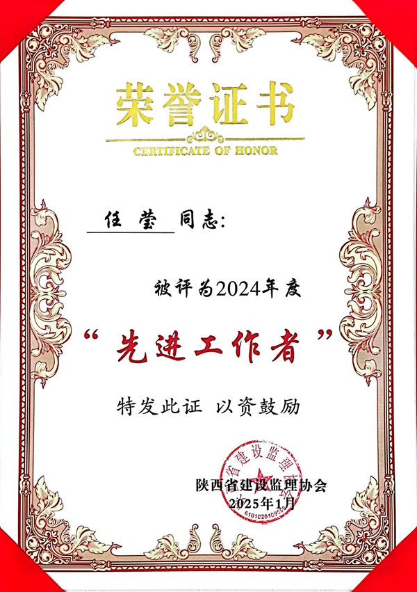 同時(shí),公司辦公室主任任瑩同志憑借在行業(yè)內(nèi)的杰出表現(xiàn)和突出貢獻(xiàn)榮獲了“2024年度陜西省建設(shè)監(jiān)理協(xié)會(huì)先進(jìn)工作者”榮譽(yù)稱號(hào)。