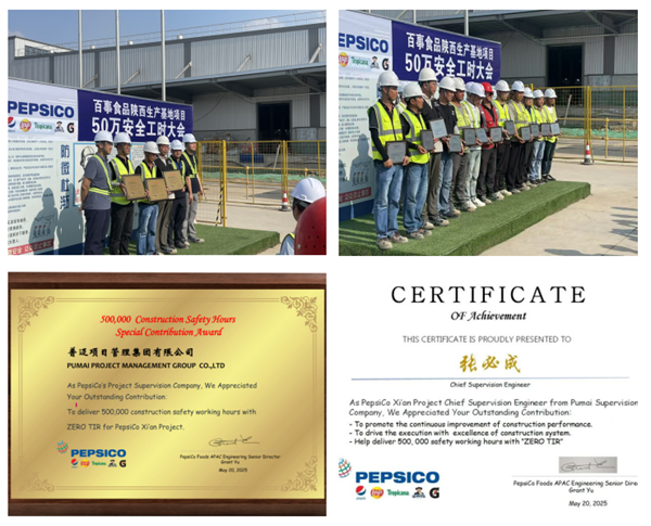 2025年5月28日,在公司監(jiān)理的百事食品(陜西)生產(chǎn)基地項(xiàng)目現(xiàn)場(chǎng),建設(shè)單位百事可樂(lè)食品(陜西)有限公司舉行了隆重的表彰儀式,為公司頒發(fā)了沉甸甸的“50萬(wàn)安全工時(shí)特別貢獻(xiàn)獎(jiǎng)”獎(jiǎng)牌,并授予項(xiàng)目總監(jiān)理工程師張必成及專業(yè)監(jiān)理工程師陳強(qiáng)、黨艷明、劉宜鑫等同志“50萬(wàn)安全工時(shí)優(yōu)秀管理獎(jiǎng)”。