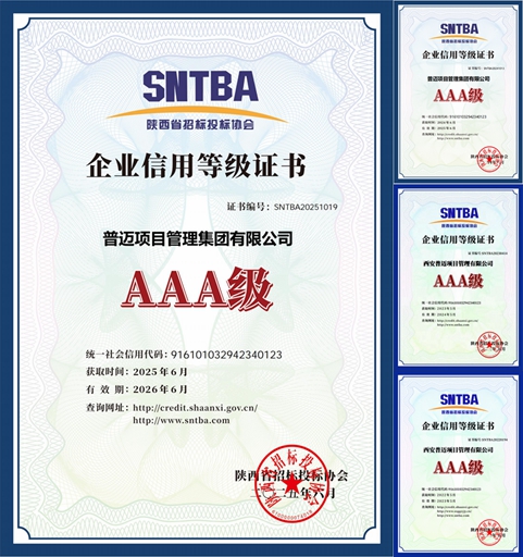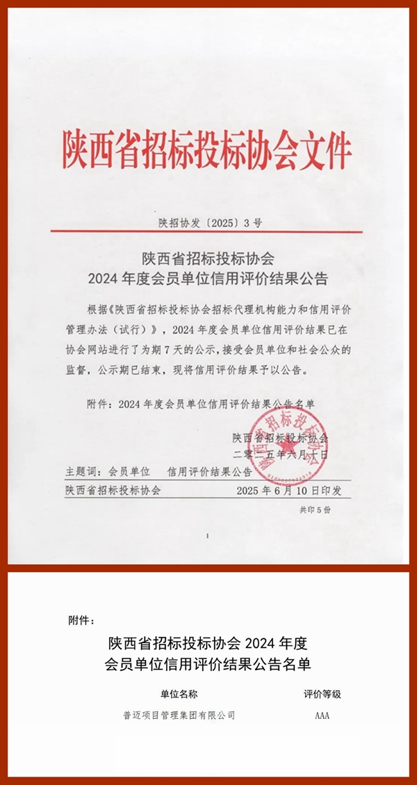 2025年6月10日,陜西省招標(biāo)投標(biāo)協(xié)會發(fā)布《陜西省招標(biāo)投標(biāo)協(xié)會2024年度會員單位信用評價(jià)結(jié)果公告》,普邁項(xiàng)目管理集團(tuán)有限公司憑借規(guī)范的經(jīng)營管理和優(yōu)質(zhì)的履約能力,又一次榮獲AAA級信用評價(jià)。
