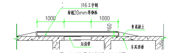 本項(xiàng)目車庫與主樓間設(shè)置沉降后澆帶,車庫各區(qū)域間設(shè)置伸縮后澆帶,車庫進(jìn)行分段施工,后澆帶部位外挑長度0.5-2m。后澆帶寬均為800mm,故在行車道位置擬用16#工字鋼架設(shè)在后澆帶上以便過車(附圖2)。