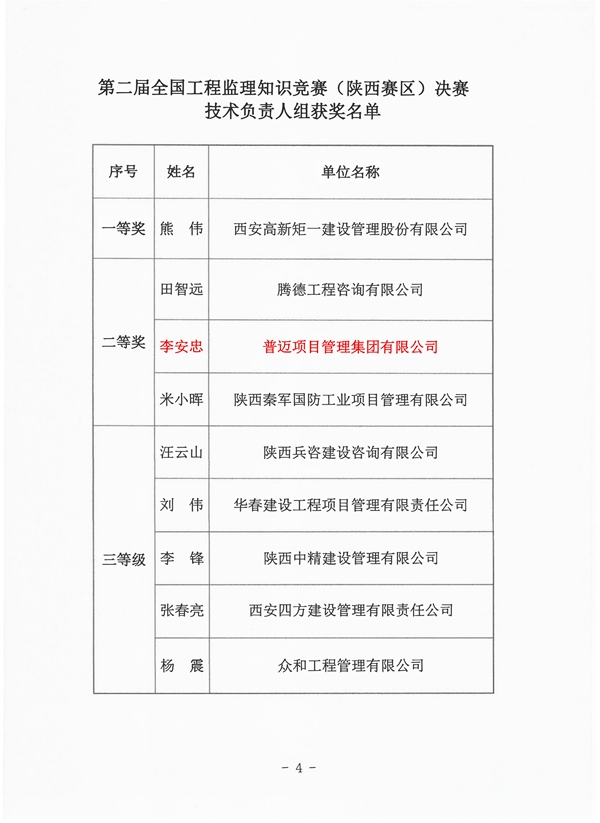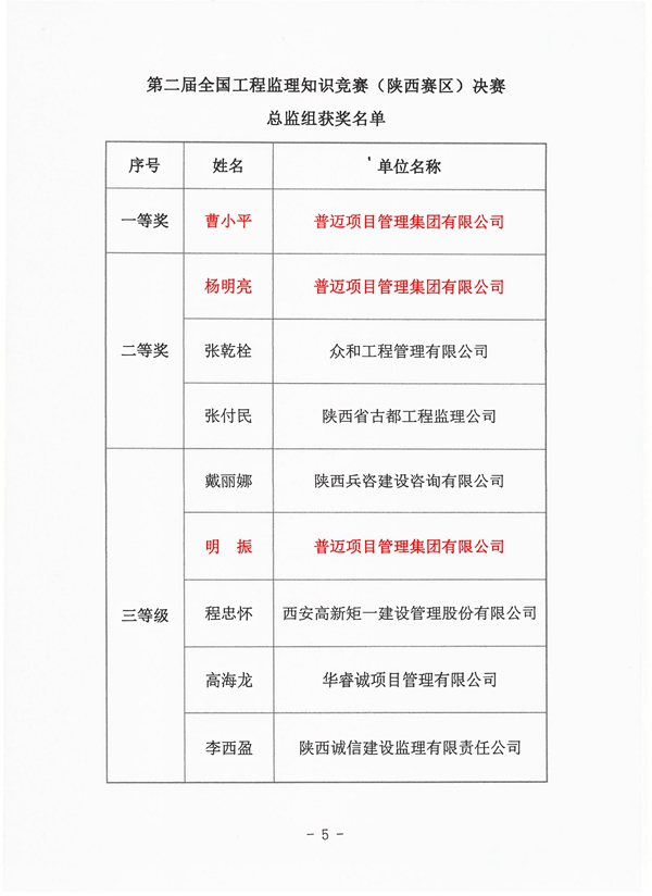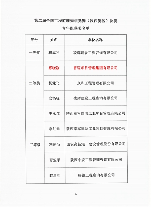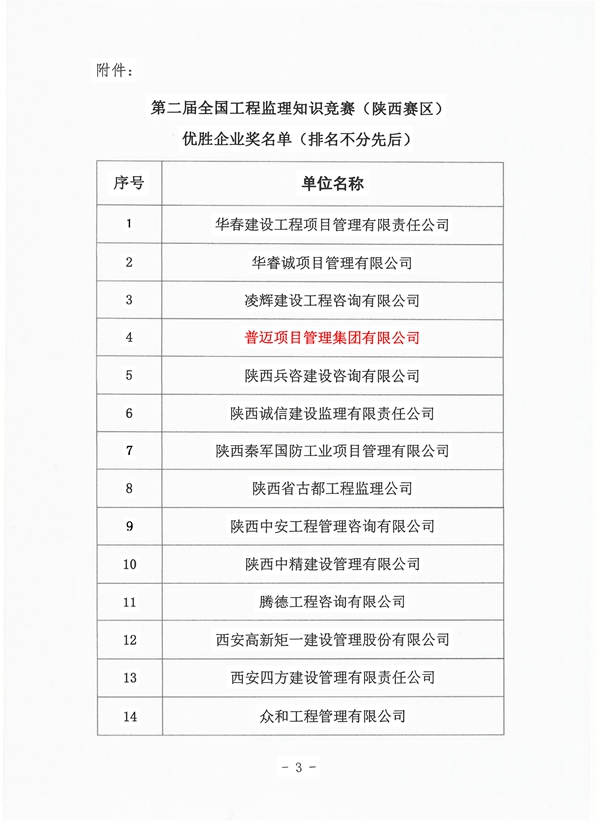 2025年9月29日,陜西省建設監(jiān)理協(xié)會公布了第二屆全國監(jiān)理行業(yè)知識競賽(陜西賽區(qū))決賽結(jié)果,普邁項目管理集團有限公司榮獲優(yōu)勝企業(yè)獎,5名參賽員工取得優(yōu)異成績,光榮上榜!