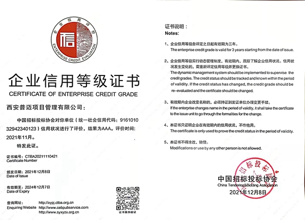 企業(yè)信用等級(jí)證書(中國(guó)招標(biāo)投標(biāo)協(xié)會(huì)AAA級(jí)企業(yè))
