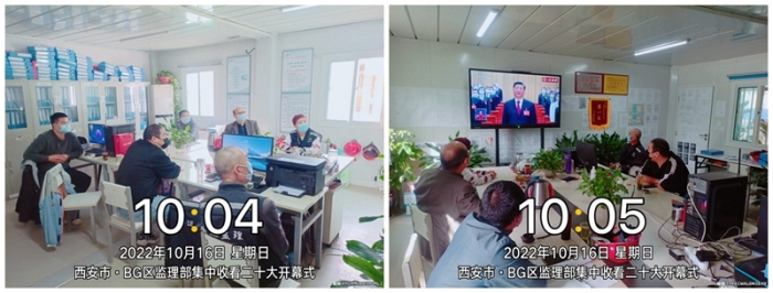 西安電子谷項目BG區(qū)監(jiān)理部在監(jiān)理辦公室集中收看二十大開幕會